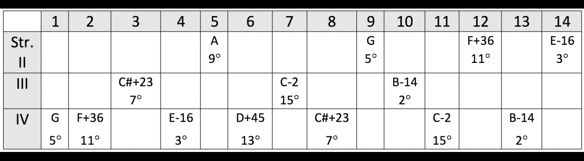 The re-tuning of each string is indicated using the name of the pitch, and the number of cents by which it is tuned sharp or flat, e.g. F+36)